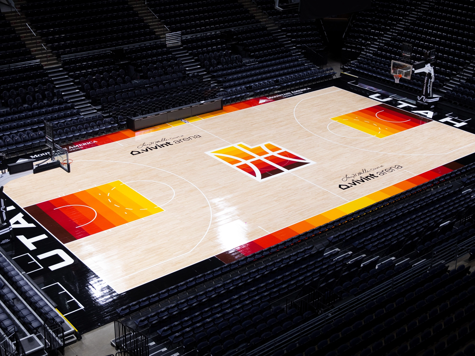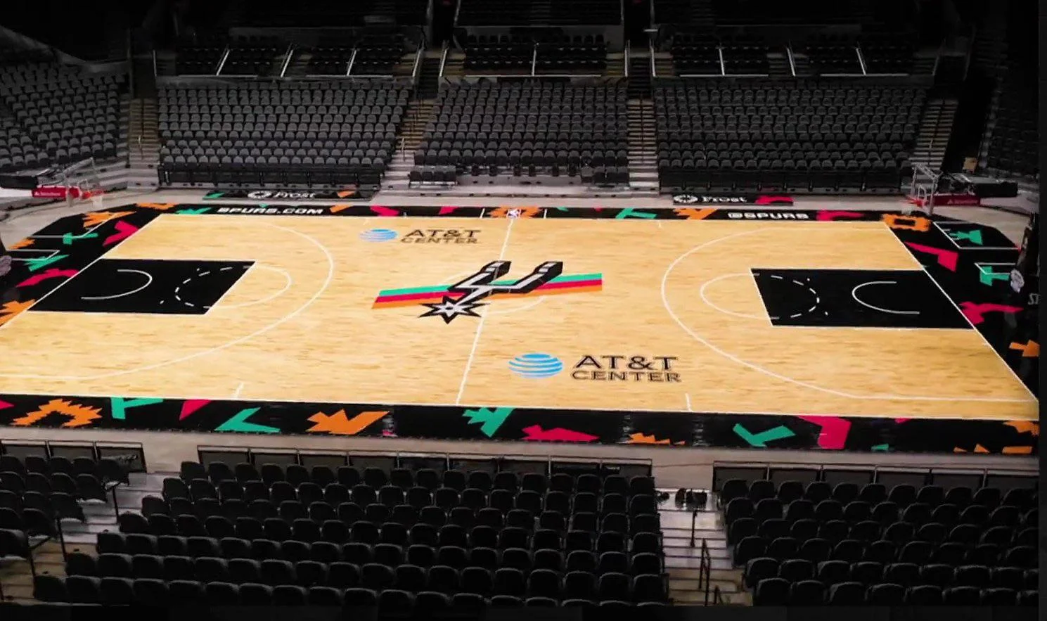 球馆木地板功能区划分和画线标记和logo图案制作;蓝联体育油性彩漆